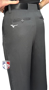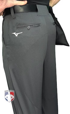 Plate and Base umpire pants are a polyester and spandex blend in charcoal grey, flat-front, with an expander waistband, and an embroidered white Mizuno RunBird logo above the left rear pocket. They feature a Japanese influenced extra wide "player's" style rear belt loop.